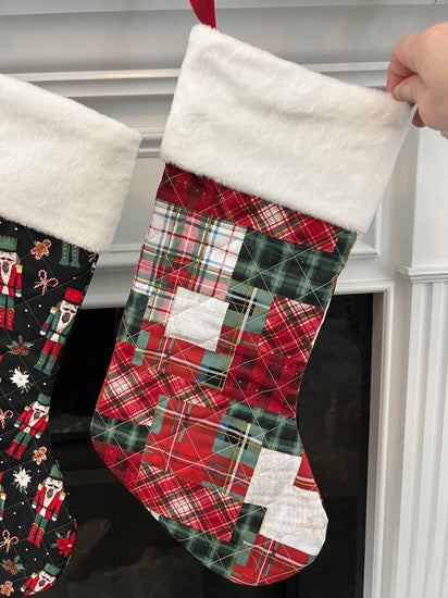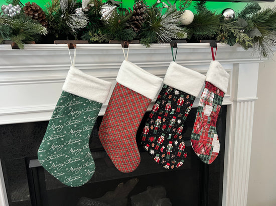 Add timeless charm to your holiday décor with our handcrafted quilted Christmas stockings. Each stocking features a unique festive pattern — from classic plaid and elegant script to cheerful Nutcrackers and holiday patchwork — all topped with a soft, cozy cuff.