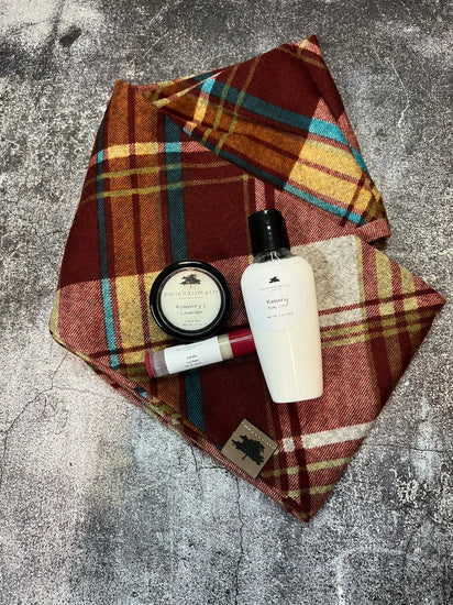 This gift set pairs a richly toned plaid scarf with calming, handcrafted skincare essentials, creating a warm and inviting bundle perfect for crisp air, changing leaves, and thoughtful autumn gifting.